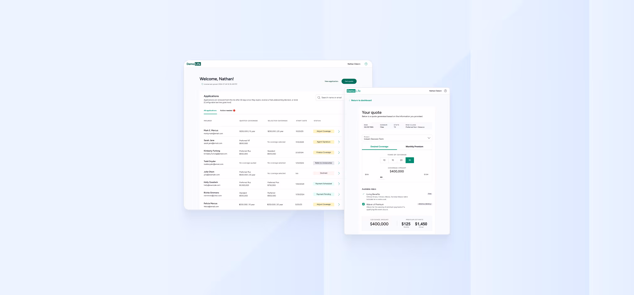 We’re the leading new business and administration technology partner for life insurance carriers looking to modernize efficiently and quickly. We support digital quote, illustration, and application journeys for customers and agents, offer a sophisticated underwriting engine and workbench interface, provide seamless payment, billing, and policy delivery services, and make administration a breeze with portal experiences for customers and support staff alike, as well as full TPA services trusted by top carriers. Our platform supports term life, final expense, IUL, and more — and can be implemented as a full end-to-end or modular solution. This gives carriers the flexibility to modernize in the way that makes sense for their unique needs.