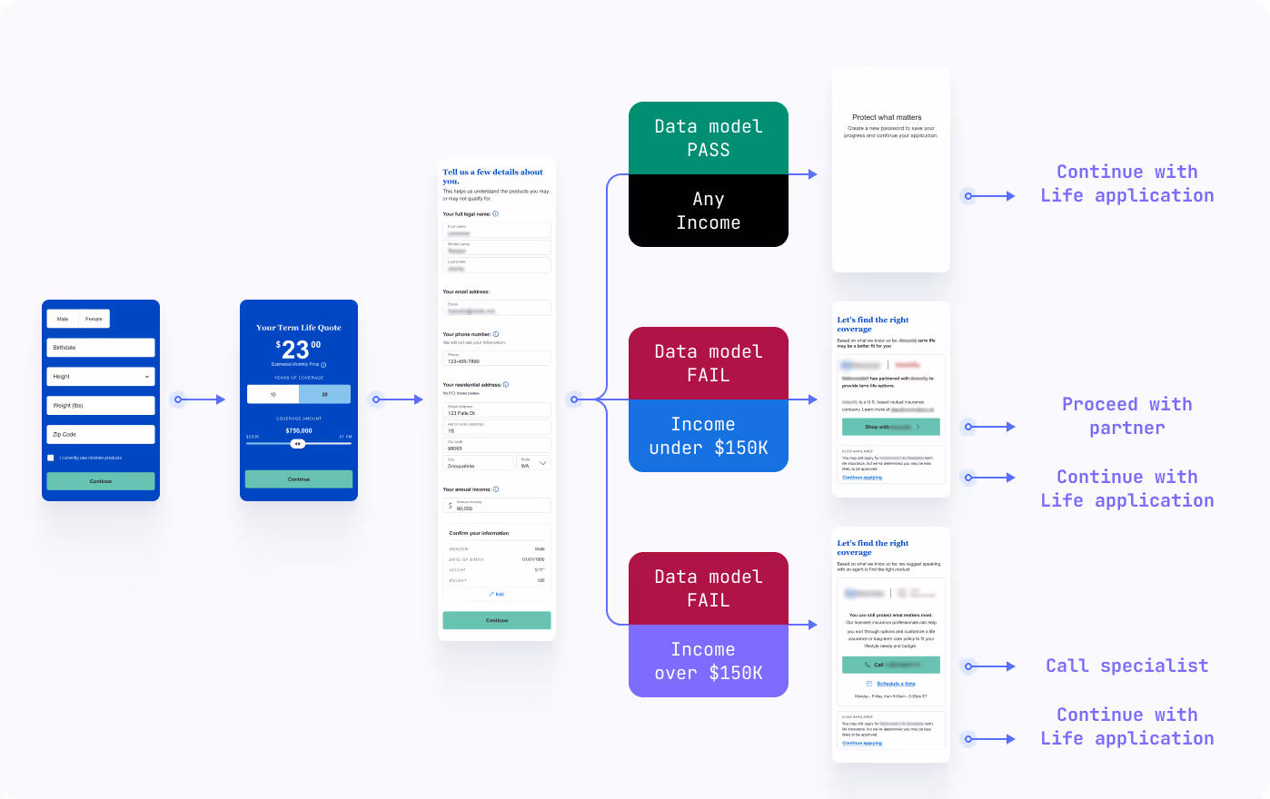 In real-time, Recommendation Engine will serve an applicant a data-backed, tailored experience. For example, based on information gathered at the quote stage, a customer may be ushered through an instant underwriting flow, an in-house agent flow, or off-boarded to a third party partner to explore product options.